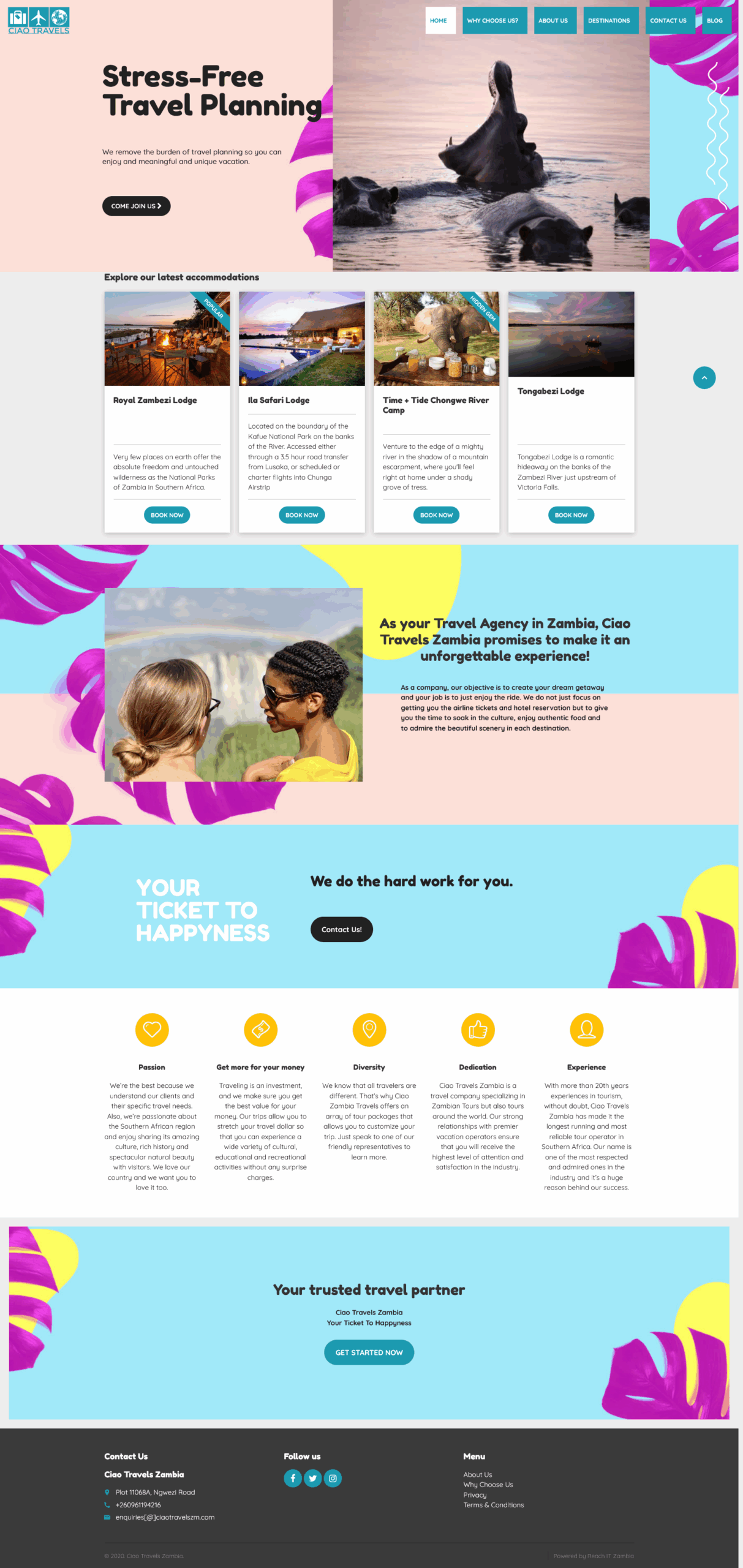 In the end, the website delivered exactly what the client was looking for: a professional, vibrant, and reliable online presence that represents who they are. It serves as both a promotional tool and a customer touchpoint, helping streamline inquiries and improve client confidence. Ciao Travels Zambia now has a platform they can proudly use to grow their brand, expand their reach, and deliver memorable travel experiences to a global audience.